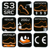 NEO S3 SRC minősítésű munkabakancs, amely két anyagból készült felsőrésszel rendelkezik, ló bőrből és oxford szövetből, fémhurokkal, valamint a szerkezetet erősítő egyszerű és dupla varrással. A kompozit talpbetét 200J ütésvédelmet biztosít, míg a kevlárból készült, átszúrás elleni talpbetét védi a lábfej alsó részét. A bakancs megerősített megerősített sarokrésszel, kettős anyagú talppal ami elllenálló az olajjal, benzinnel és más szerves oldószerekkel szemben. A sarok vízáteresztő képessége és vízfelvétele megfelel az EN ISO 20345 szabvány szerinti biztonsági lábbelik osztályozásának. 39-47 méretben kapható.