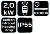 Az infra hősugárzó működési elve nem hősugárzáson alapul, nem a légtér fűtése, hanem a tárgyak infravörös hullámmal történő fűtése, a hőérzet emelése. A sugárzás szögénél figyelni kell, hogy érje azt a területet, ahol az ember tartózkodik. Egy idő után a levegő is melegszik közvetetten, a tárgyak felmelegedéséből adódóan, de nem a légtér fűtése az elsődleges. A NEO 90-039 ipari sugárzó fűtőtest infravörös sugárzást bocsát ki, amely kellemes és egészséges melegséget biztosít, hasonlóan a napsütéshez. A sugárzó fűtőtest azonnal eléri teljes fűtési teljesítményét a bekapcsolást követően, és akár 32 négyzetméteres területet is képes fűteni. Az IP55-ös védettségi osztálynak köszönhetően ellenáll a kedvezőtlen időjárási körülményeknek, így kültéren is használható. Könnyen szerelhető falra, mennyezetre vagy állványra. A távirányító segítségével 4 különböző fűtési szintet és üzemidőt állíthat be, ami megkönnyíti a használatát és vezérlését. Tulajdonságai: Teljesítmény: 2000 W, Védettségi osztály: IP55, Fűtőelem: Karbonszálas infra hősugárzó, Fűtött felület: 16-32 m2, Nagy fűtési távolság: maximum 5 m, Telepítési lehetőségek: Mennyezet, falak, állvány, Távirányítóról állítható 4 fűtési szint, Üzemidőállítás: 0-24 óra, Élettartam: 10.000 üzemóra Felhasználási terület: Professzionális használatra ajánlott, tökéletes megoldás éttermek kerthelyiségének fűtésére