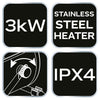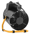 3 kW teljesítményű ipari elektromos fűtőberendezés, fűtőelem rozsdamentes acél, állítható termosztát, túlmelegedés elleni védelem, ventilátorral, állítható szög, szigetelt fogantyú, IPX4 nedves területeken történő használatra, légáram 354 m3/h