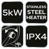 5 kW ipari elektromos fűtés, fűtőelem rozsdamentes acél, állítható termosztát, túlmelegedés elleni védelem, ventilátorral, állítható szög, szigetelt fogantyú, IPX4 nedves területeken történő használatra, légáram 366 m3/h