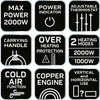 - 2 fűtési fokozat - 1000 W/2000 W,