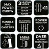 A NEO TOOLS fűtőberendezés be-/kikapcsolóval rendelkezik, jelzőfénnyel és állítható termosztáttal, amely lehetővé teszi a kívánt hőmérséklet pontos beállítását. A biztonság érdekében a fűtőtest túlmelegedés elleni védelemmel és billenőkapcsolóval van ellátva. A fogantyú és a görgők megkönnyítik a mozgást, míg a zsinórtartó és az 1,35 m hosszúságú kábel kényelmet biztosít.